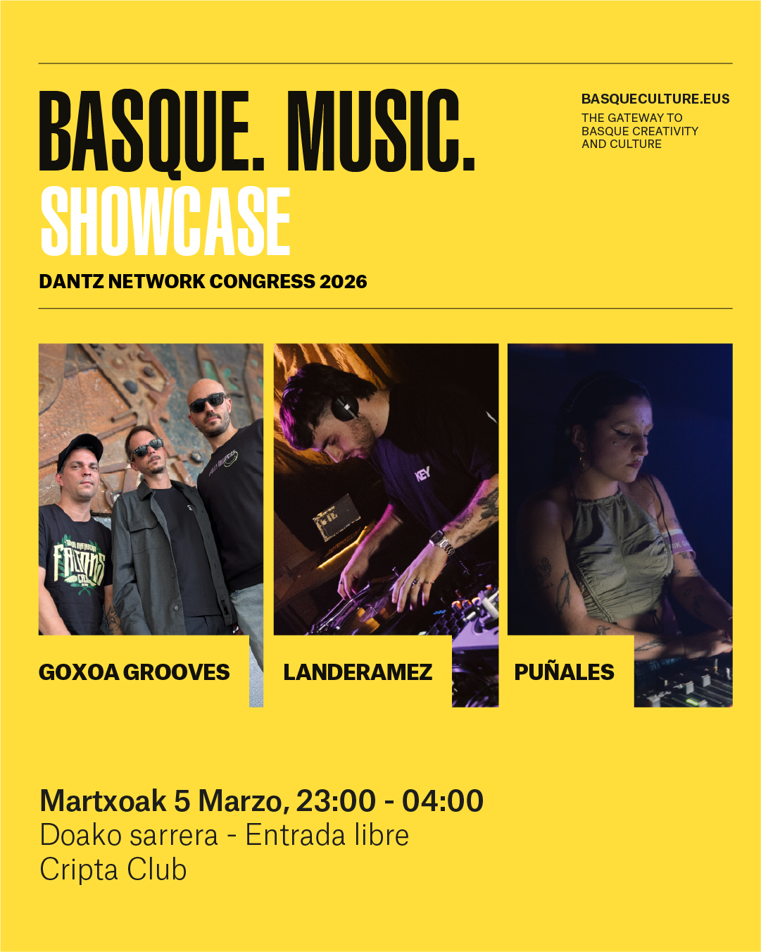 Musika elektronikoari buruzko Dantz Network Congress nazioarteko kongresuaren bigarren edizioan, Goxoa Grooves, Landeramez eta Puñales izango dira Dantz erakundeak BASQUE.MUSIC.-i esker hautatutako Euskal Herriko hiru artistak, haien proposamena sektoreko profesionalen aurrean aurkezteko eta Donostian showcase bat eskaintzeko.
