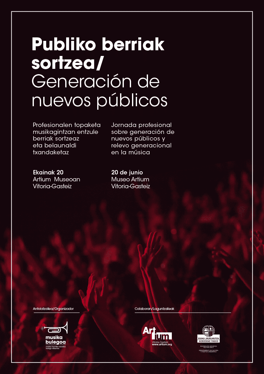 La educación musical, el IVA cultural, la gratuidad de la música, la experiencia del encuentro social en los festivales, las nuevas prácticas de escucha o la innovación tecnológica son algunas de las cuestiones que se abordarán en la Jornada “Generación de nuevos públicos y relevo generacional”, que tendrá lugar el martes, 20 de junio, en el Centro-Museo Vasco de Arte Contemporáneo, Artium, en Vitoria-Gasteiz. El encuentro, organizado por Euskal Herriko Musika Bulegoa-Oficina de la Música de Euskal Herria, pretende reflexionar sobre las nuevas tendencias en el consumo musical, coincidiendo con la celebración del Día Internacional de la Música.