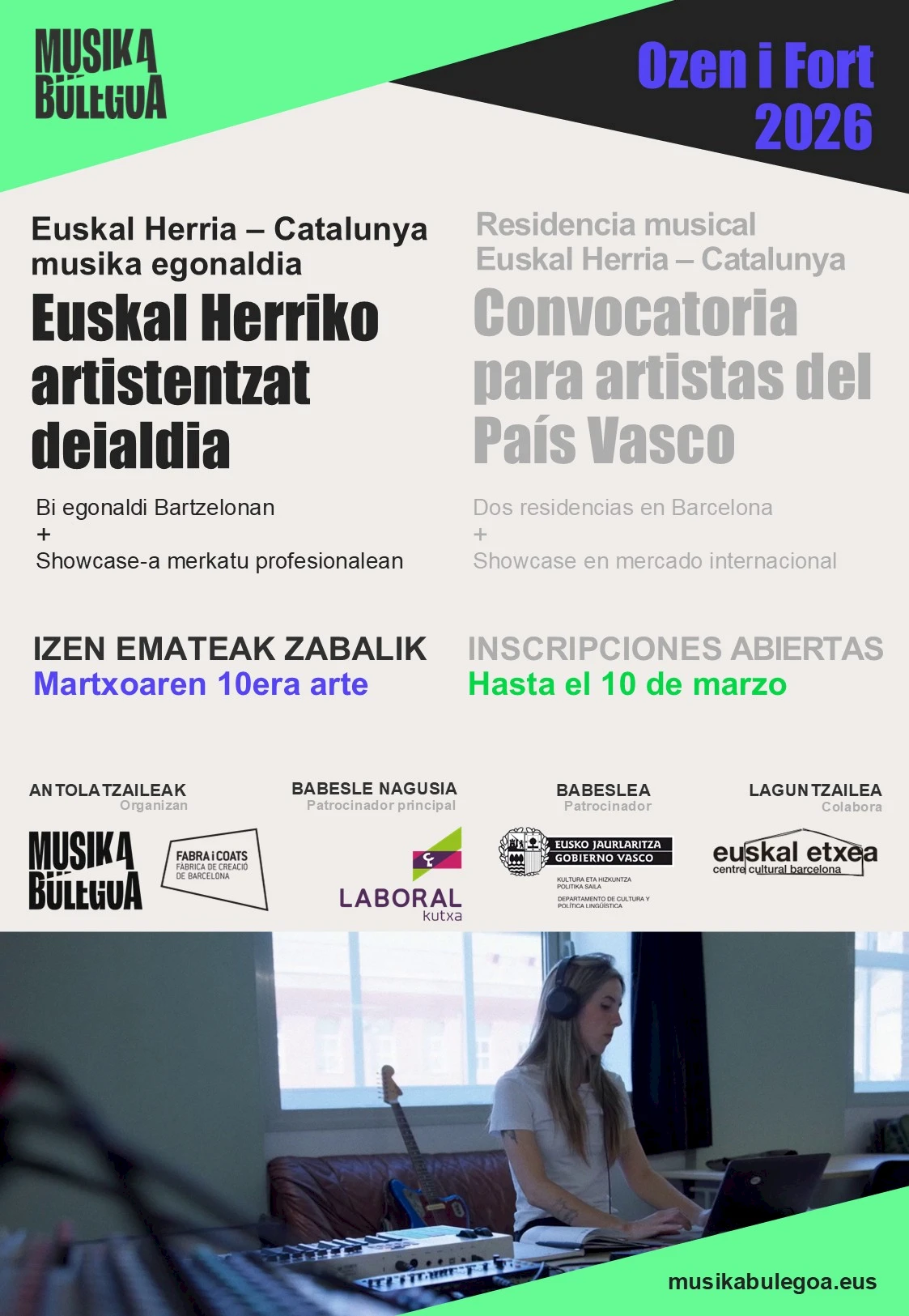 Musika Bulegoak eta Fabra i Coats – Fàbrica de Creació-k (Bartzelona) Ozen i Fort-en bigarren edizioan, Euskadi eta Kataluniaren arteko sorkuntza bateratuko egoitza artistikoan, parte hartuko duen Euskal Herriko artista bat hautatzeko deialdia egin dute.